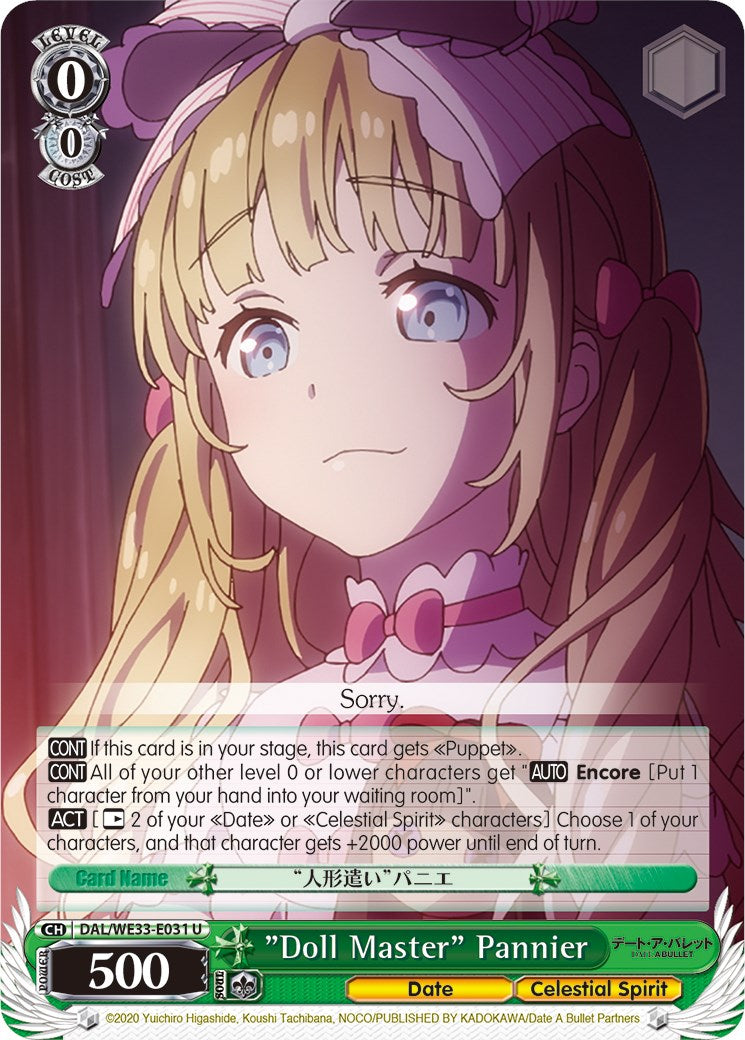 [CONT] If this card is in your stage, this card gets "Puppet". [CONT] All of your other level 0 or lower characters get "[AUTO] Encore [Put 1 character from your hand into your waiting room]". [ACT] [[REST] 2 of your "Date" or "Celestial Spirit" characters] Choose 1 of your characters, and that character gets +2000 power until end of turn.